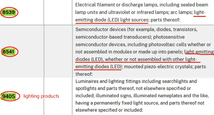 Internationally, LED lights are mainly classified under HS codes 8539, 8541, and 9405. Additional digits are added to further specify products’ features and uses. Below are classifications and descriptions from hts.usitc.gov (US Harmonized Tariff Schedule).